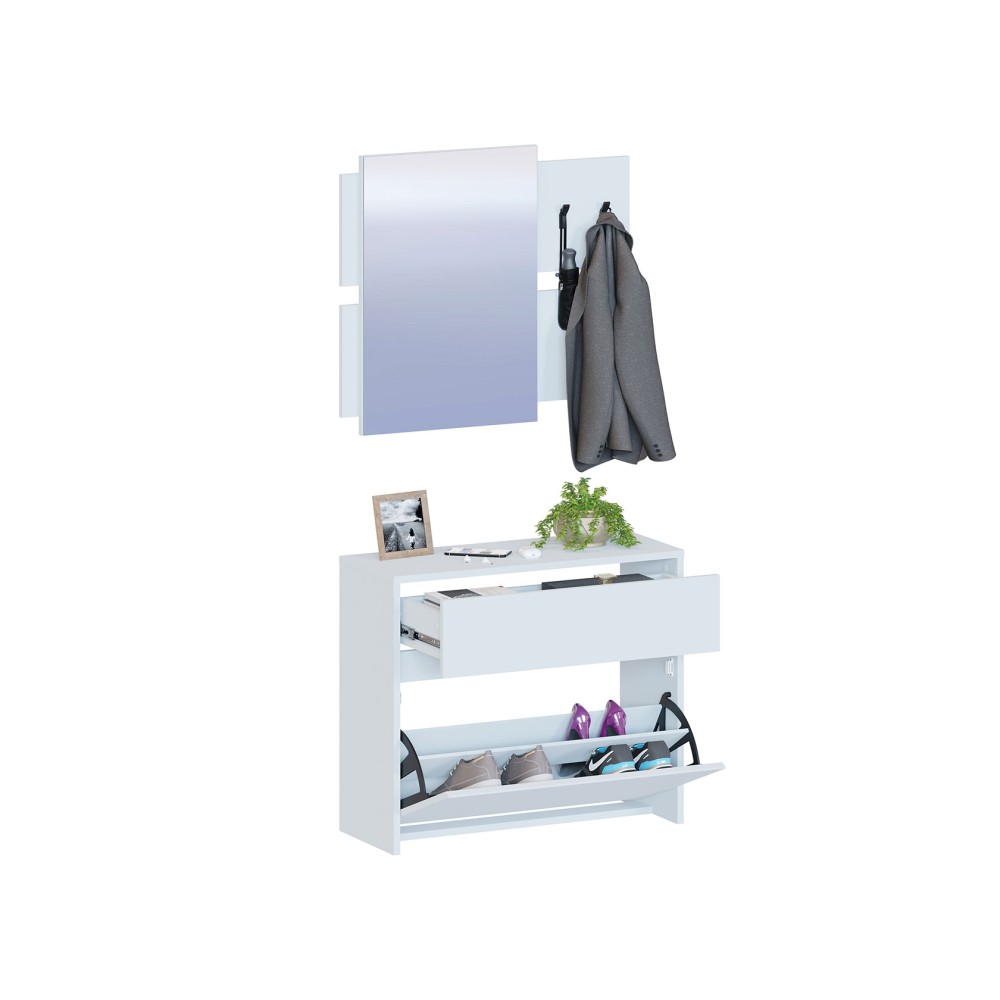 Зеркало 623*434 оснащено двумя металлическими крючками для верхней одежды, что обеспечивает долговечность и надежность изделия. Подвесная обувница представлена вместительным ящиком с шариковыми направляющими полного выдвижения и секцией, позволяющей разместить до 6 пар обуви. Дверцы открываются без ручек благодаря спилу под 45 градусов на фасадах.