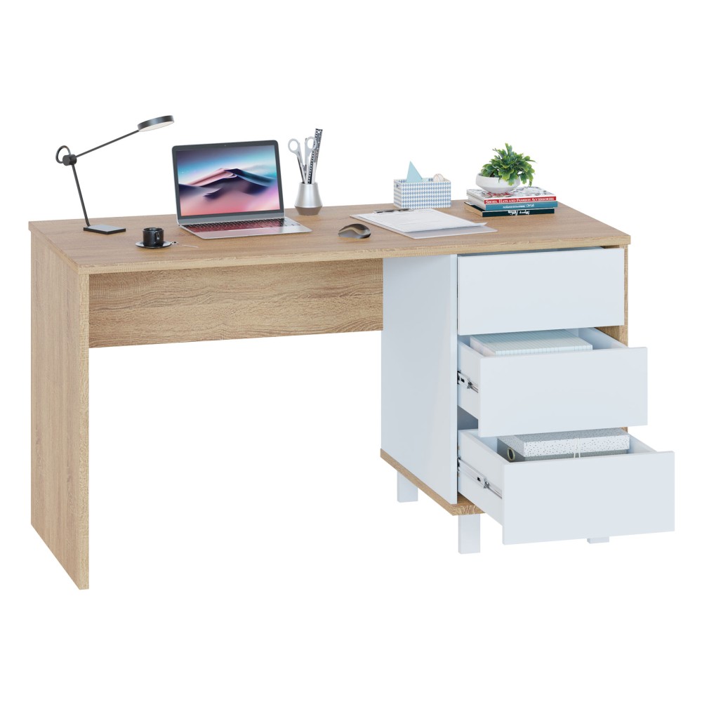 Стильный письменный стол СПМ-210 станет надежным помощником в ежедневной работе и организации комфортного рабочего пространства. Лаконичный дизайн и отсутствие лицевой фурнитуры позволяют модели удачно вписаться в любой современный интерьер. Просторная столешница размером 1350*600 мм и тумба с тремя выдвижными ящиками дают возможность организовать функциональную систему хранения и разместить под рукой всё необходимое. Массивная столешница, боковины стола и основание тумбы толщиной ЛДСП 22 мм придают мебели уникальную контрастность и выразительность. Металлические ножки в белом цвете создают гармоничный баланс и подчеркивают элегантность внешнего вида.