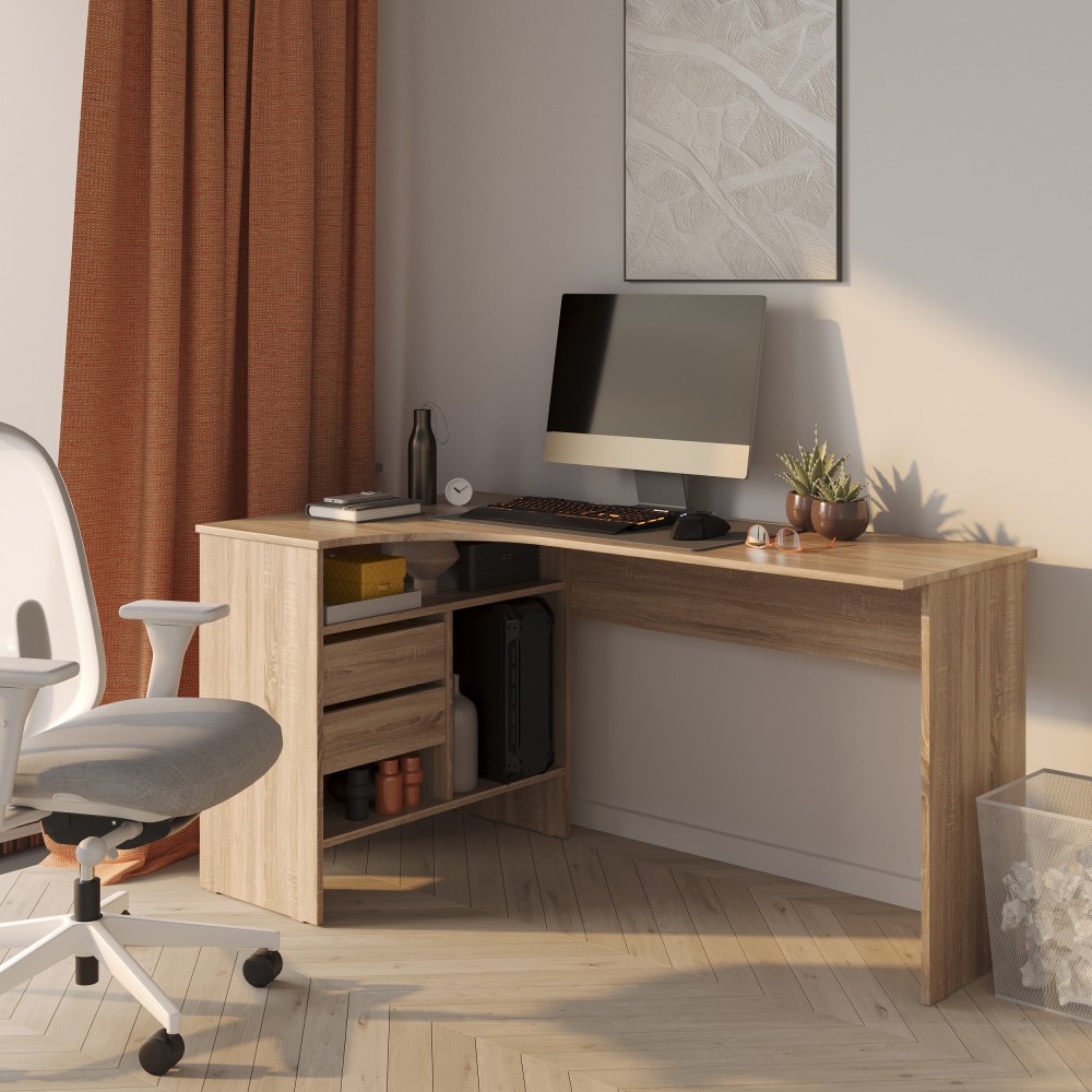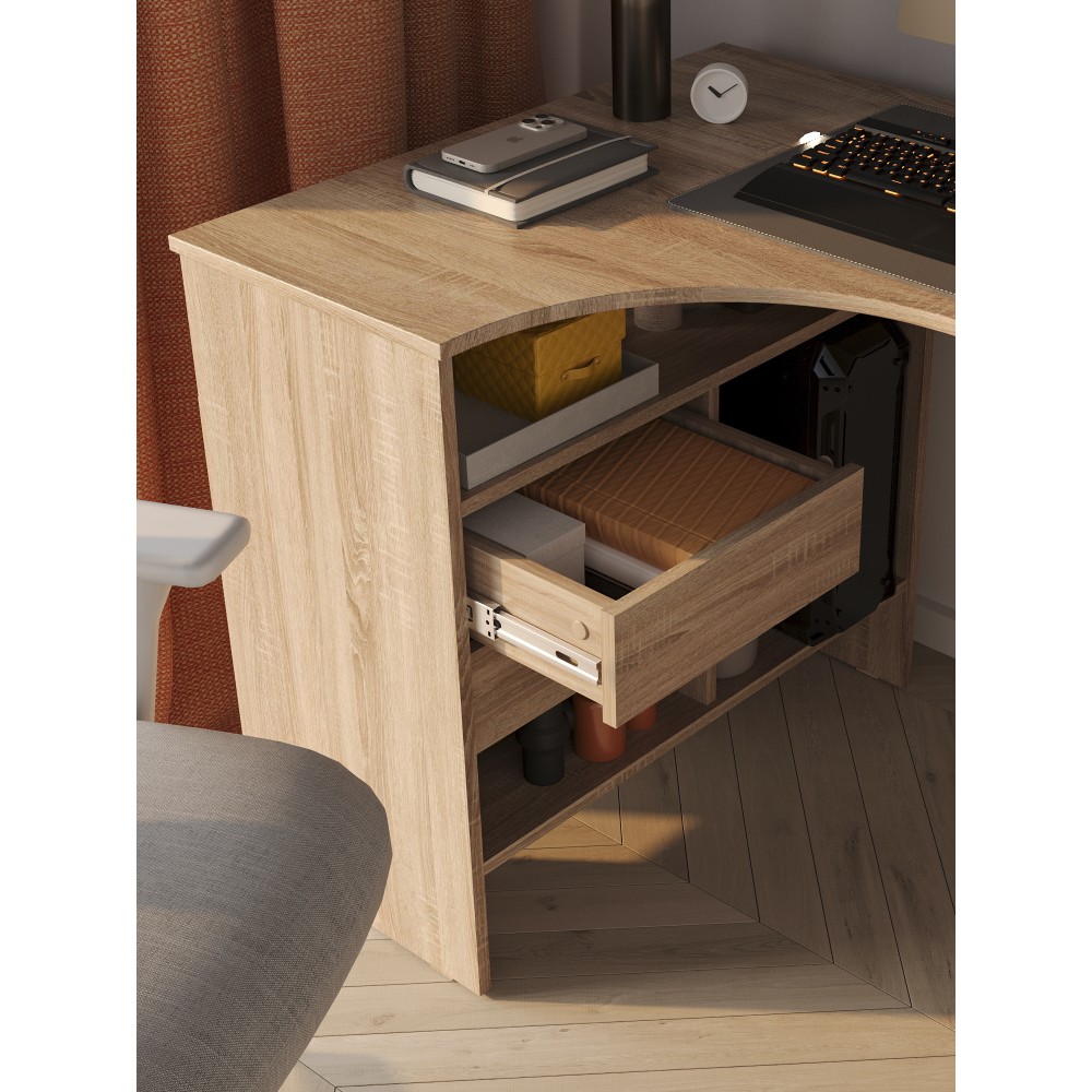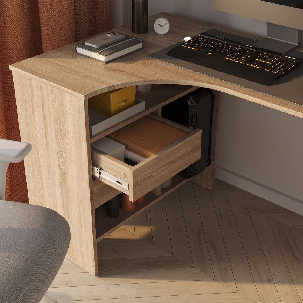 Угловой письменный стол СПм-25 — идеально решение для обустройства полноценного рабочего места в домашнем кабинете или офисе. На широкой столешнице найдется место для большого монитора, клавиатуры или ноутбука, а также сопутствующей техники. В выдвижных ящиках и открытых отделениях удобно хранить книги и канцелярию. Кроме того, конструкцией предусмотрена ниша под системный блок.