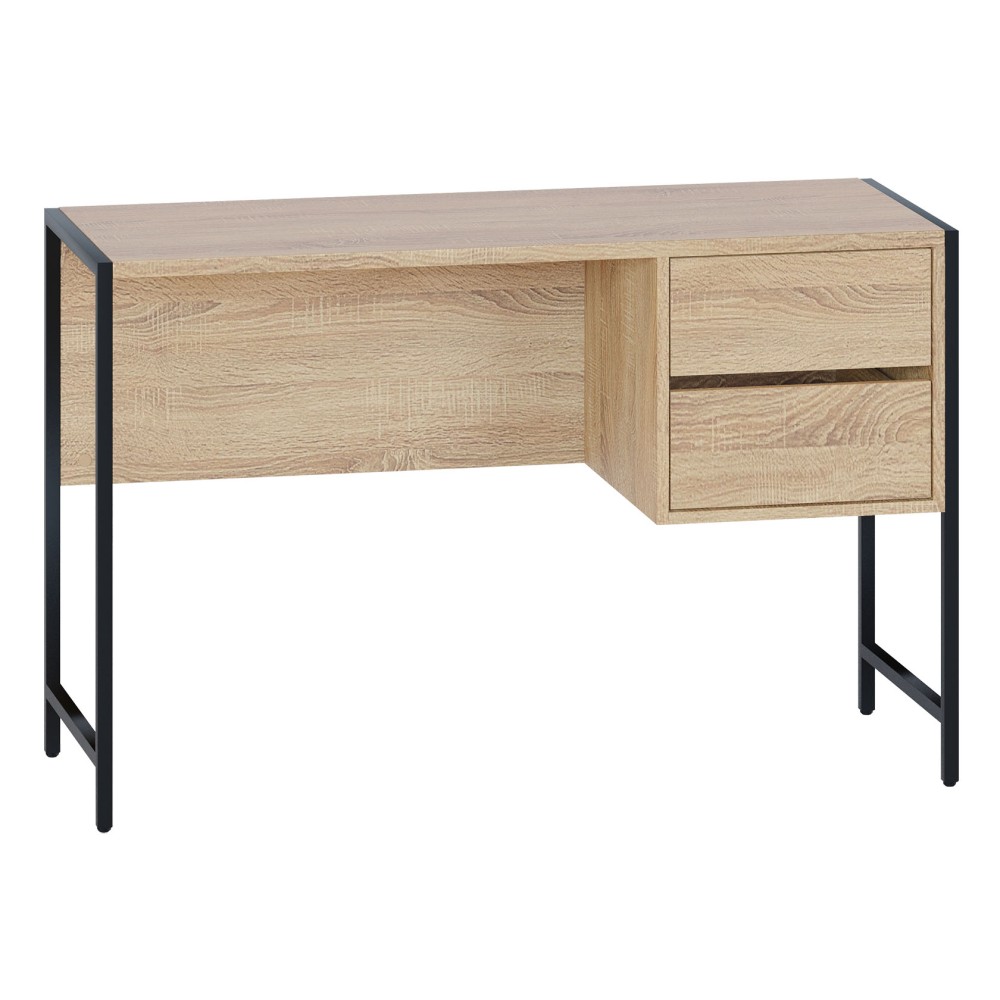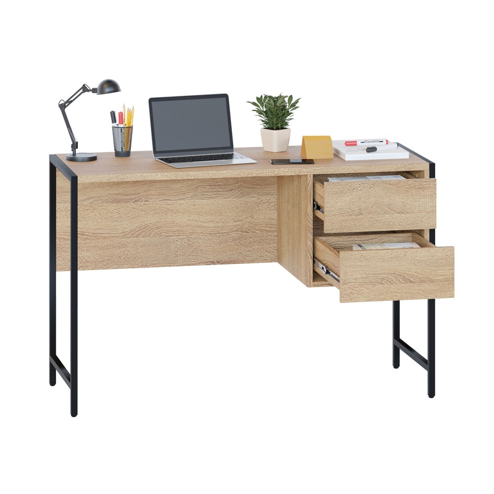Письменный стол на металлокаркасе СПМ-404 — удобная и элегантная мебель для обустройства домашнего кабинета или учебного места в стиле лофт. Модель компактна за счет столешницы шириной 1170 мм и глубиной 449 мм и встроенной тумбы с двумя выдвижными ящиками. Для плавного и бесшумного открывания ящиков предусмотрены надежные шариковые направляющие, а вместо привычных ручек сделаны стильные вырезы между фасадами. Металлические опоры с регулируемыми подпятниками и столешница толщиной 22 мм с противоударной кромкой сделают рабочий процесс максимально комфортным и продуктивным.