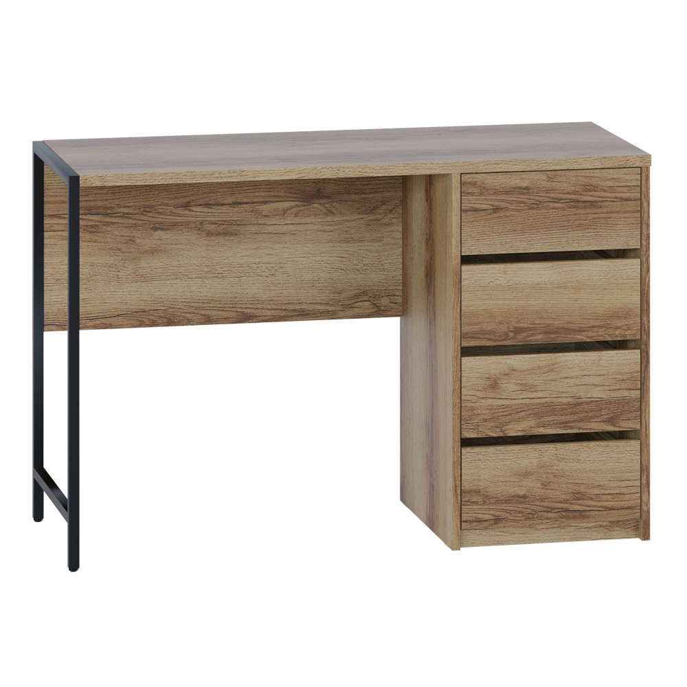 Стильный письменный стол СПМ-405 идеально подходит для организации полноценного рабочего места, эффективно задействуя пространство в доме или офисе. За счет интересного решения с металлическими опорами на регулируемых подпятниках и столешницы толщиной 22 мм с противоударной кромкой создается современная обстановка в стиле лофт. Модель оснащена вместительной тумбой с четырьмя ящиками, а также столешницей шириной 1170 мм и глубиной 449 мм для удобного хранения всей необходимой канцелярии и документов. Ящики с надежными шариковыми направляющими обеспечивают плавное бесшумное открывание, а вместо привычных ручек сделаны стильные вырезы между фасадами.