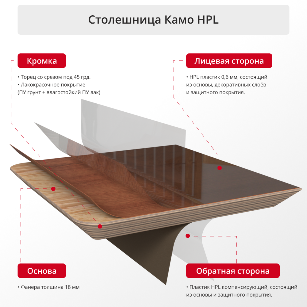 Столешница Камо 2 HPL изготовлена из фанеры толщиной 18 мм и покрыта с лицевой стороны одним из 20 вариантов HPL пластика, а с тыльной стороны HPL пластиком белого цвета. Торцевая сторона столешницы покрываются лаком. Срез торца выполнен под углом 45°.