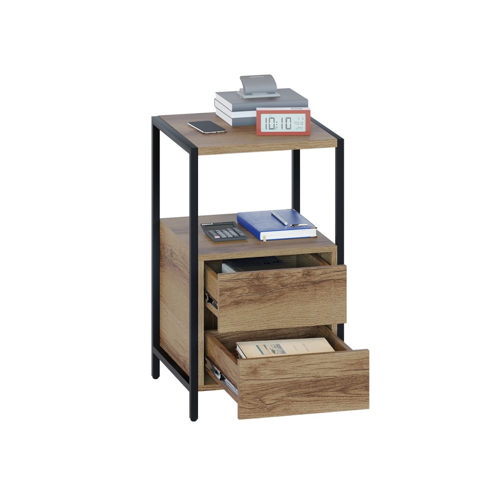 Габаритные размеры ВхШхГ 755x437x449 мм. Многофункциональная тумба КТ-400 станет отличным дополнением стильного домашнего кабинета или офисного пространства благодаря разнообразной системе хранения. Изделие выполнено в современном стиле лофт и смотрится эффектно благодаря черному металлическому каркасу на регулируемых подпятниках и деталям толщиной 22 мм с противоударной кромкой. Открытая ниша и верхняя полка обеспечат легкий доступ к рабочим принадлежностям и технике, а два вместительных выдвижных ящика разместят все необходимые документы и канцелярию. Для плавного и бесшумного открывания ящиков предусмотрены надежные шариковые направляющие, а вместо привычных ручек сделаны стильные вырезы между фасадами. Характеристики:Материал столешницы: ЛДСП 22 мм, кромка ПВХ 2 мм. Материал корпуса: металл, ЛДСП 16 мм, кромка ПВХ 0,4 мм. Материал фасадов: ЛДСП 16 мм, кромка ПВХ 0,4 мм. Внутренние габариты ящика (ВхШхГ): 8,1 х 30,8 х 38 см. Тип направляющих: шариковые полного выдвижения. Максимальная нагрузка на столешницу и полку: 20 кг. Максимальная нагрузка на ящик: 5 кг.